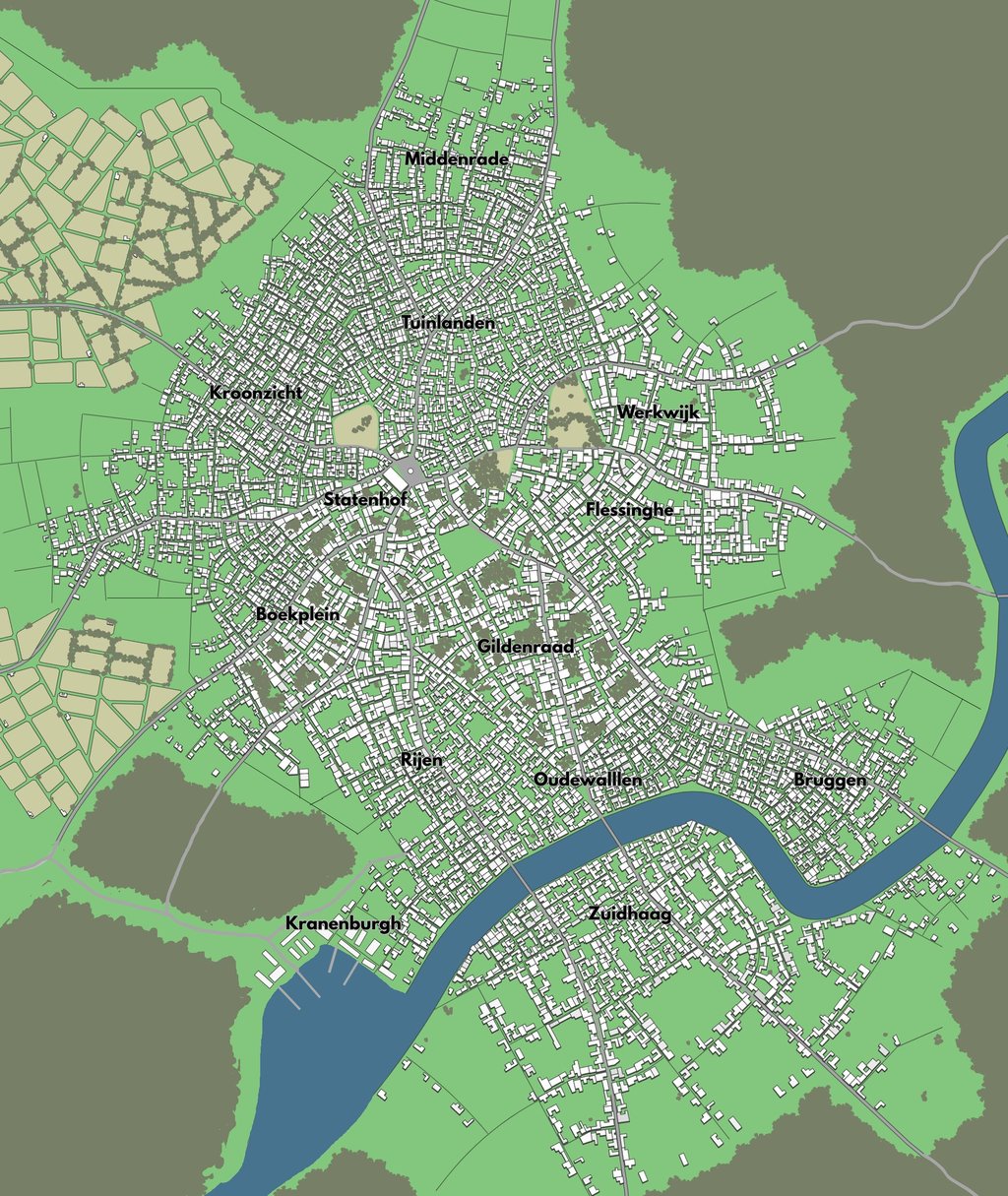 Kranenburgh is Wallen’s old wharf-and-warehouse quarter, occupying the southwestern reaches of the city along the lower banks of the Haag. It is defined by long quays, crane lines, bonded storehouses, counting sheds, cooperies, chandlers, rope stores, and crowded dock inns. Though commercially vital, it is not a prestigious district; most residents are wharf laborers, sailors, tally clerks, lightermen, and carters who serve the ceaseless movement of cargo between river and sea. The district is noisy, damp, and perpetually congested, with broad quay roads near the waterfront giving way to narrower lanes behind the storehouses. Fires, theft, and smuggling are constant concerns, making Kranenburgh one of the most heavily watched commercial districts in the capital.