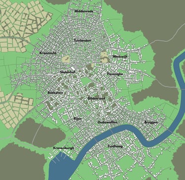 Rijen is an upper-class district lying north of Kranenburgh and northwest of Oudewallen. It is known for its broad residential streets, merchant mansions, investment houses, and well-kept private courts, occupied by wealthy traders, senior guild families, successful shipowners, and lesser officeholders who want proximity to the city center without living amidst the crush of the riverfront. Rijen acts as a transition between Wallen’s old commercial core and its more refined northern quarters. The district has fewer warehouses and more formal homes, private gardens, and discreet chapels, giving it a quieter and more orderly atmosphere than neighboring wards. It is considered respectable, established, and comfortably prosperous rather than ostentatious.